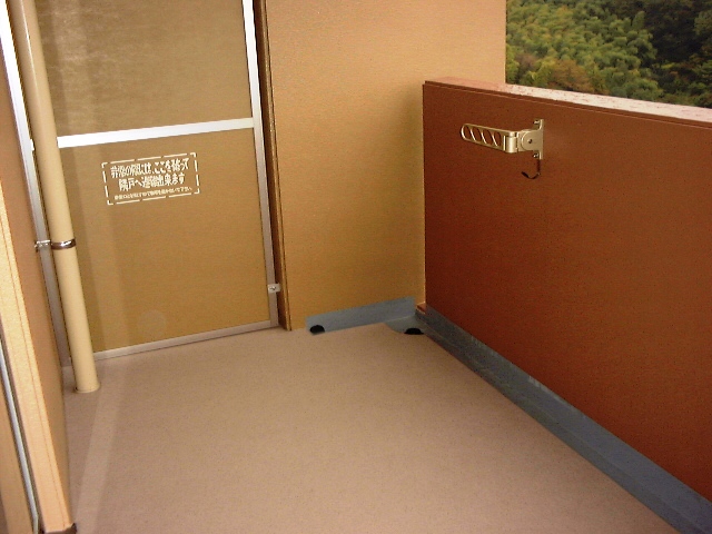 | ベランダの隅。北東にあたります お隣さん家への「非常用壁」 |